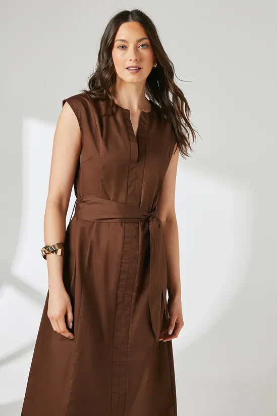 Brown Notch Neck Tie Waist Midi Dress